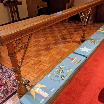 A break occurs at the altar rail gate for a kneeler that reflects our parish's name, Trinity: God the Father, God the Son, God the Holy Spirit.